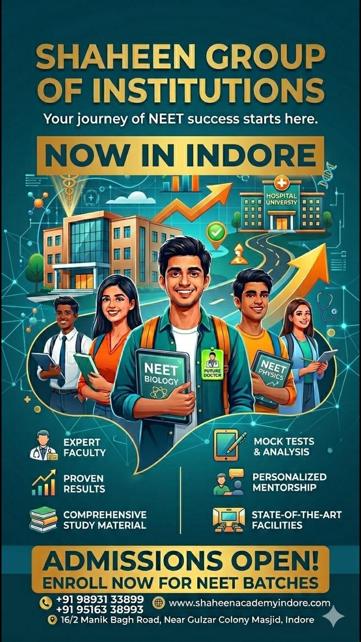 Looking for the best NEET coaching in Indore with proven results and expert faculty? Shaheen Group of Institutions – Now in Indore is your trusted destination for NEET 2026 preparation. We provide result-oriented coaching designed to help students secure top ranks in NEET and get admission into leading medical colleges. 𝗪𝗵𝘆 𝗖𝗵𝗼𝗼𝘀𝗲 𝗦𝗵𝗮𝗵𝗲𝗲𝗻 𝗔𝗰𝗮𝗱𝗲𝗺𝘆 𝗜𝗻𝗱𝗼𝗿𝗲 𝗳𝗼𝗿 𝗡𝗘𝗘𝗧 𝗣𝗿𝗲𝗽𝗮𝗿𝗮𝘁𝗶𝗼𝗻? ✅ Expert NEET Faculty ✅ Proven NEET Results ✅ Comprehensive Study Material ✅ Regular Mock Tests & Detailed Analysis ✅ Personalized Mentorship Program ✅ State-of-the-Art Classrooms & Facilities Our structured approach ensures students get concept clarity in Physics, Chemistry, and Biology, along with regular practice tests based on the latest NEET pattern. NEET Coaching in Indore with Proven Success Strategy At Shaheen Academy Indore, we focus on: NCERT-based concept mastery Chapter-wise test series All India level mock exams Performance tracking & parent reporting Doubt-clearing sessions If you are searching for: Top NEET coaching near Manik Bagh Road Indore Affordable NEET coaching with best results Medical entrance coaching in Indore Your search ends here. Admissions Open for NEET 2026 Batches Seats are limited. Enroll now to secure your place in the most trusted NEET coaching institute in Indore. 📍𝐂𝐞𝐧𝐭𝐫𝐞 𝐀𝐝𝐝𝐫𝐞𝐬𝐬 𝟏: 𝟏𝟔/𝟐 𝐌𝐚𝐧𝐢𝐤 𝐁𝐚𝐠𝐡 𝐑𝐨𝐚𝐝, 𝐍𝐞𝐚𝐫 𝐆𝐮𝐥𝐳𝐚𝐫 𝐂𝐨𝐥𝐨𝐧𝐲 𝐌𝐚𝐬𝐣𝐢𝐝, 𝐈𝐧𝐝𝐨𝐫𝐞 𝟒𝟓𝟐𝟎𝟏𝟒 📍𝐂𝐞𝐧𝐭𝐫𝐞 𝐀𝐝𝐝𝐫𝐞𝐬𝐬 𝟐: 𝟓, 𝐐𝐚𝐝𝐚𝐫 𝐜𝐨𝐥𝐨𝐧𝐲, 𝐊𝐡𝐚𝐣𝐫𝐚𝐧𝐚 , 𝐨𝐩𝐩𝐨𝐬𝐢𝐭𝐞 𝐃𝐚𝐫𝐠𝐚𝐡, 𝐈𝐧𝐝𝐨𝐫𝐞 𝟒𝟓𝟐𝟎𝟏𝟔 📞 𝐂𝐚𝐥𝐥 𝐍𝐨𝐰: +𝟗𝟏 𝟗𝟖𝟗𝟑𝟏 𝟑𝟑𝟖𝟗𝟗 | +𝟗𝟏 𝟗𝟓𝟏𝟔𝟑 𝟑𝟖𝟗𝟗𝟑 | +𝟗𝟏𝟗𝟔𝟖𝟓𝟕𝟑𝟑𝟖𝟗𝟗 🌐 Website: www.shaheenacademyindore.com