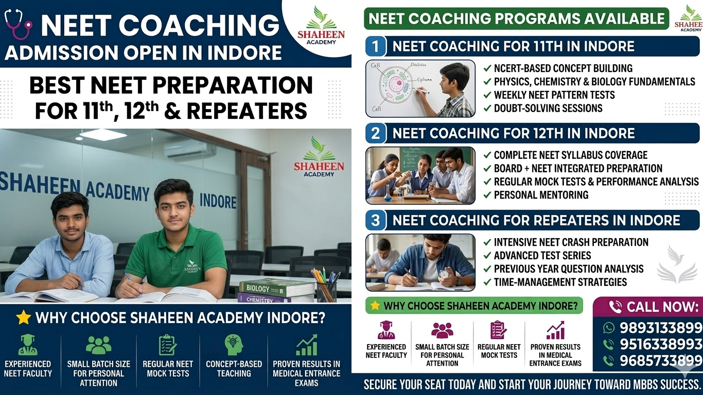 Looking for the best NEET coaching in Indore to secure your seat in a top medical college? Your search ends here. Shaheen Academy Indore offers expert NEET preparation program s specially designed for Class 11th students, Class 12th students, and NEET repeaters who want to crack the medical entrance exam with high scores. 📚 𝐍𝐄𝐄𝐓 𝐂𝐨𝐚𝐜𝐡𝐢𝐧𝐠 𝐏𝐫𝐨𝐠𝐫𝐚𝐦𝐬 𝐀𝐯𝐚𝐢𝐥𝐚𝐛𝐥𝐞 𝟏️⃣ 𝐍𝐄𝐄𝐓 𝐂𝐨𝐚𝐜𝐡𝐢𝐧𝐠 𝐟𝐨𝐫 𝟏𝟏𝐭𝐡 𝐢𝐧 𝐈𝐧𝐝𝐨𝐫𝐞 𝐒𝐭𝐚𝐫𝐭 𝐲𝐨𝐮𝐫 𝐍𝐄𝐄𝐓 𝐩𝐫𝐞𝐩𝐚𝐫𝐚𝐭𝐢𝐨𝐧 𝐞𝐚𝐫𝐥𝐲 𝐰𝐢𝐭𝐡 𝐚 𝐬𝐭𝐫𝐨𝐧𝐠 𝐟𝐨𝐮𝐧𝐝𝐚𝐭𝐢𝐨𝐧. 𝐎𝐮𝐫 𝐂𝐥𝐚𝐬𝐬 𝟏𝟏 𝐍𝐄𝐄𝐓 𝐟𝐨𝐮𝐧𝐝𝐚𝐭𝐢𝐨𝐧 𝐩𝐫𝐨𝐠𝐫𝐚𝐦 𝐟𝐨𝐜𝐮𝐬𝐞𝐬 𝐨𝐧: ✔ 𝐍𝐂𝐄𝐑𝐓-𝐛𝐚𝐬𝐞𝐝 𝐜𝐨𝐧𝐜𝐞𝐩𝐭 𝐛𝐮𝐢𝐥𝐝𝐢𝐧𝐠 ✔ 𝐏𝐡𝐲𝐬𝐢𝐜𝐬, 𝐂𝐡𝐞𝐦𝐢𝐬𝐭𝐫𝐲 & 𝐁𝐢𝐨𝐥𝐨𝐠𝐲 𝐟𝐮𝐧𝐝𝐚𝐦𝐞𝐧𝐭𝐚𝐥𝐬 ✔ 𝐖𝐞𝐞𝐤𝐥𝐲 𝐍𝐄𝐄𝐓 𝐩𝐚𝐭𝐭𝐞𝐫𝐧 𝐭𝐞𝐬𝐭𝐬 ✔ 𝐃𝐨𝐮𝐛𝐭-𝐬𝐨𝐥𝐯𝐢𝐧𝐠 𝐬𝐞𝐬𝐬𝐢𝐨𝐧𝐬 Our structured curriculum, experienced faculty, and regular testing system make us one of the top NEET coaching institutes in Indore. 📚 NEET Coaching Programs Available 1️⃣ NEET Coaching for 11th in Indore Start your NEET preparation early with a strong foundation. Our Class 11 NEET foundation program focuses on: ✔ NCERT-based concept building ✔ Physics, Chemistry & Biology fundamentals ✔ Weekly NEET pattern tests ✔ Doubt-solving sessions 2️⃣ NEET Coaching for 12th in Indore For students in Class 12 preparing for NEET, we provide: ✔ Complete NEET syllabus coverage ✔ Board + NEET integrated preparation ✔ Regular mock tests & performance analysis ✔ Personal mentoring by expert faculty 3️⃣ NEET Coaching for Repeaters in Indore If you are taking a drop year to crack NEET, our repeater batch helps you maximize your score. ✔ Intensive NEET crash preparation ✔ Advanced test series ✔ Previous year question analysis ✔ Time-management strategies Many repeaters from our institute improve their scores significantly and get admission into top medical colleges. ⭐ Why Choose Shaheen Academy Indore? ✔ Experienced NEET faculty ✔ Small batch size for personal attention ✔ Regular NEET mock tests ✔ Concept-based teaching ✔ Proven results in medical entrance exams We focus on concept clarity, disciplined preparation, and smart exam strategy to help students achieve their dream of becoming doctors. 📢 𝐍𝐄𝐄𝐓 𝐂𝐨𝐚𝐜𝐡𝐢𝐧𝐠 𝐀𝐝𝐦𝐢𝐬𝐬𝐢𝐨𝐧 𝐎𝐩𝐞𝐧 𝐢𝐧 𝐈𝐧𝐝𝐨𝐫𝐞 𝐀𝐝𝐦𝐢𝐬𝐬𝐢𝐨𝐧𝐬 𝐚𝐫𝐞 𝐧𝐨𝐰 𝐨𝐩𝐞𝐧 𝐟𝐨𝐫: ✔ 𝐍𝐄𝐄𝐓 𝐜𝐨𝐚𝐜𝐡𝐢𝐧𝐠 𝐟𝐨𝐫 𝟏𝟏𝐭𝐡 𝐢𝐧 𝐈𝐧𝐝𝐨𝐫𝐞 ✔ 𝐍𝐄𝐄𝐓 𝐜𝐨𝐚𝐜𝐡𝐢𝐧𝐠 𝐟𝐨𝐫 𝟏𝟐𝐭𝐡 𝐢𝐧 𝐈𝐧𝐝𝐨𝐫𝐞 ✔ 𝐍𝐄𝐄𝐓 𝐜𝐨𝐚𝐜𝐡𝐢𝐧𝐠 𝐟𝐨𝐫 𝐫𝐞𝐩𝐞𝐚𝐭𝐞𝐫𝐬 𝐢𝐧 𝐈𝐧𝐝𝐨𝐫𝐞 ✔ 𝐍𝐄𝐄𝐓 𝐟𝐨𝐮𝐧𝐝𝐚𝐭𝐢𝐨𝐧 𝐜𝐨𝐚𝐜𝐡𝐢𝐧𝐠 𝐢𝐧 𝐈𝐧𝐝𝐨𝐫𝐞 📞 𝐂𝐚𝐥𝐥 𝐍𝐨𝐰: 𝟗𝟖𝟗𝟑𝟏𝟑𝟑𝟖𝟗𝟗 𝟗𝟓𝟏𝟔𝟑𝟑𝟖𝟗𝟗𝟑 𝟗𝟔𝟖𝟓𝟕𝟑𝟑𝟖𝟗𝟗 Secure your seat today and start your journey toward MBBS success.