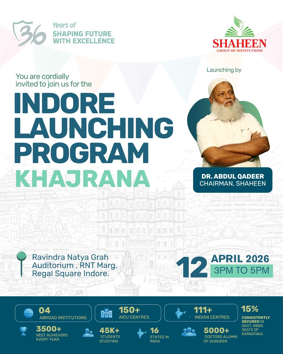 𝐒𝐡𝐚𝐡𝐞𝐞𝐧 𝐆𝐫𝐨𝐮𝐩 𝐨𝐟 𝐈𝐧𝐬𝐭𝐢𝐭𝐮𝐭𝐢𝐨𝐧𝐬 𝐢𝐧𝐯𝐢𝐭𝐞𝐬 𝐲𝐨𝐮 𝐟𝐨𝐫 𝐋𝐚𝐮𝐧𝐜𝐡𝐢𝐧𝐠 𝐞𝐯𝐞𝐧𝐭 𝐨𝐟 𝐒𝐡𝐚𝐡𝐞𝐞𝐧 𝐀𝐜𝐚𝐝𝐞𝐦𝐲 𝐊𝐡𝐚𝐣𝐫𝐚𝐧𝐚 𝐁𝐫𝐚𝐧𝐜𝐡. 𝐃𝐚𝐭𝐞 - 𝟏𝟐/𝟎𝟒/𝟐𝟔 𝐓𝐢𝐦𝐞: 𝟎𝟐:𝟑𝟎 𝐏𝐌- 𝟎𝟒:𝟑𝟎 𝐏𝐌 𝐕𝐞𝐧𝐮𝐞: 𝐑𝐚𝐯𝐢𝐧𝐝𝐫𝐚 𝐍𝐚𝐭𝐲𝐚 𝐆𝐫𝐚𝐡, 𝐑𝐍𝐓 𝐌𝐚𝐫𝐠, 𝐑𝐞𝐠𝐚𝐥 𝐒𝐪𝐮𝐚𝐫𝐞, 𝐈𝐧𝐝𝐨𝐫𝐞. 𝐂𝐨𝐧𝐭𝐚𝐜𝐭 𝐮𝐬 - +𝟗𝟏𝟗𝟖𝟗𝟑𝟏𝟑𝟑𝟖𝟗 | +𝟗𝟏𝟗𝟓𝟏𝟔𝟑𝟑𝟖𝟗𝟗𝟑